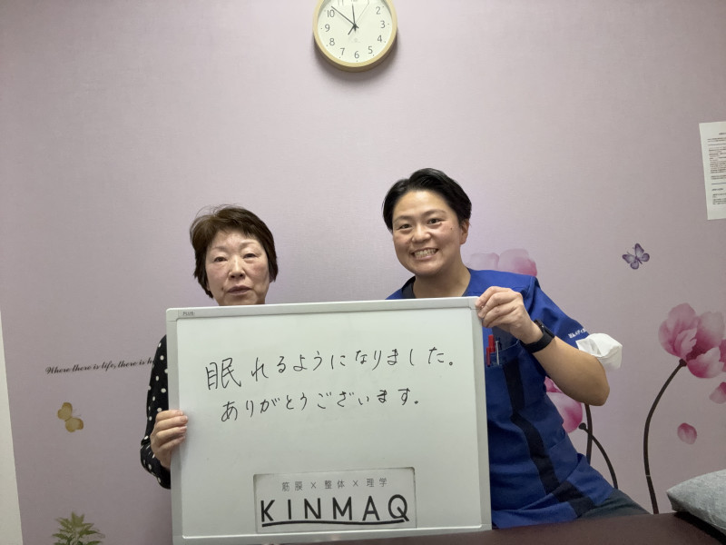 「少し眠れるようになりました!」 不眠の症状があり、夜は目が爛々と冴えてしまい、夜中に目が覚めると、そのあと全く眠れませんでした。睡眠剤も試しましたが、身体に合わなかったのか、日中ぼーっとすることが多くなり家族に心配されるほどでした。薬に頼らず不眠を解消したいと思い、KINMAQ整体院に通うことにしました。筋膜施術を受けて身体が解けていくにつれ、少しずつ眠れるようになってきています。今では睡眠剤を使わずに日々過ごすことができています。 ※個人の感想です。効果には個人差があります。 |